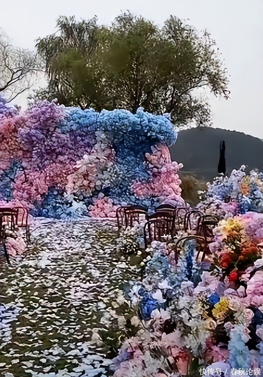 当新人携手入场时,背景并非精心布置的花艺装置,而是一棵孤零零的大树和一栋外观老旧、风格突兀的建筑楼体,构图杂乱,美感全无。