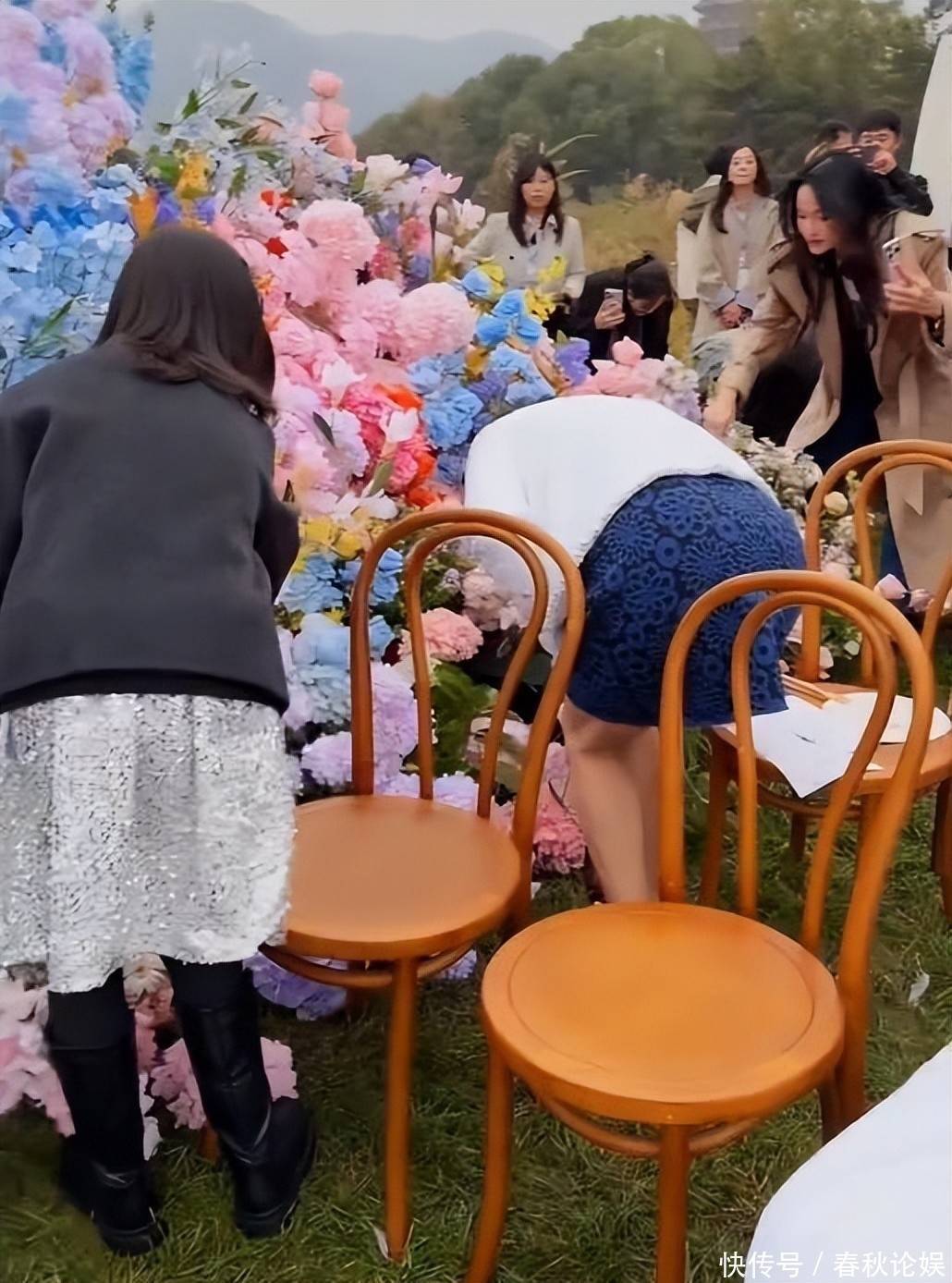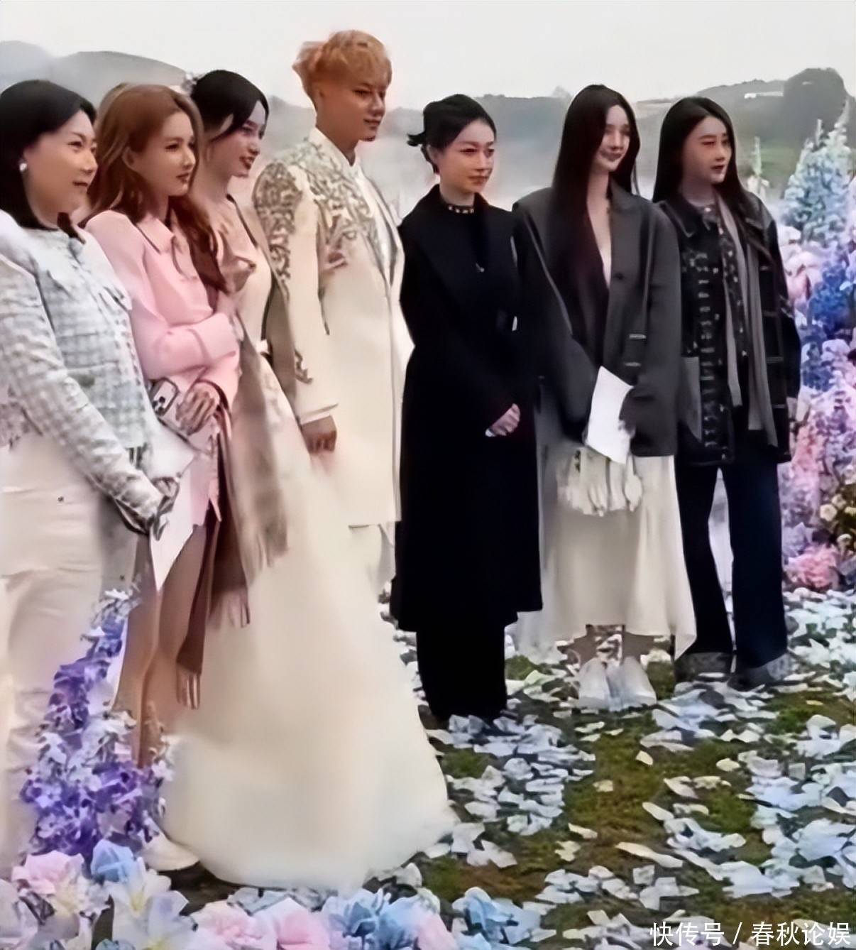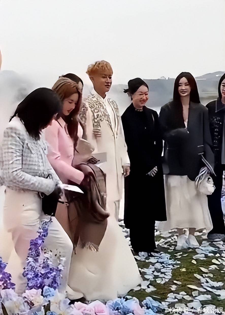合影阶段,所有来宾均裹着厚外套抵御秋寒,徐艺洋依旧披着那条备受争议的土味披肩,未曾更换。